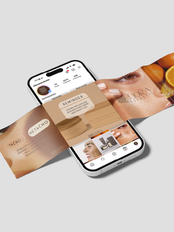 Za Eliora Aesthetics, brend posvećen njegovanju kože kroz pažljivo birane sastojke i estetski balans, radili smo kompletan brand identity – sofisticiran, čist i bezvremenski kao i dizajn pakovanja i ambalaže proizvoda koji su elegantni, minimalistički i ekskluzivni. Cilj je bio da se svaki vizuelni element uskladi sa filozofijom brenda: minimalizam i prirodna ljepota. Svaka boja, linija i tipografski detalj pažljivo je biran da komunicira povjerenje, nježnost i luksuz.