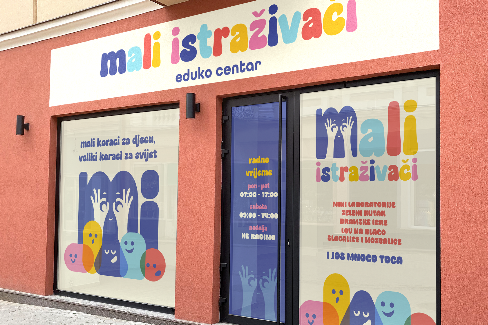 Za Male Istraživače, centar za rani razvoj i edukaciju djece, osmislili smo kompletan vizuelni identitet koji govori jezikom igre, znanja i nježne autoritativnosti. Naš zadatak bio je da stvorimo svijet u kojem se i dijete i roditelj osjećaju sigurno, motivisano i inspirisano. Kroz boje, forme i ton komunikacije — vizuelno smo preneli vrijednosti radoznalosti, znanja i topline. Pored kompletnog brendiga koji uključuje izradu logotipa, animacija, stikera i presonalizovanog sadržaja za društvene mreže rađeno je i idejno rješenje izloga objekta.