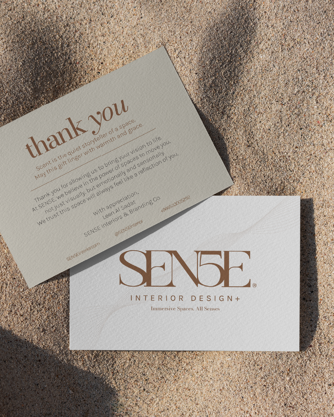 Detalji: Suptilan logo SEN5E u zlatnoj foliji ili printu, jednostavna poruka zahvalnosti, te minimalne kontakt informacije.